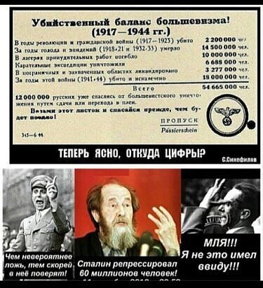 Как видим в «шедевре» Солженицина, там он приводит цифру в 60 млн. уничтоженных русских людей Сталиным режимом. Эта цифра, которая стала одним из основных штампом антисталинистов всех мастей, вошедшая в научный оборот, была изложена в листовке Геббельса, т.е. пропуске для сдачи в плен, под названием «Убийственный баланс большевизма (1917-1944 г)»!: «В годы революции и гражданской войны (1917-1923) убито – 2 200 000 чел. За годы голода и эпидемий (1918-21 г. в. и 1932-33 г.в.) умерло – 14 500 000 чел. В лагерях при принудительных работах погибло – 10 000 000 чел. Карательных экспедициях уничтожили – 6 688 000 чел. В пограничных и захваченных областей ликвидировано – 18 000 000 чел. Всего: 54 665 000 человек. 12 000 000 русских уже спаслись от большевистского уничтожения, путем сдачи в плен». Иной раз поражаешься, как при таком якобы терроре, СССР вплоть до войны имела второй прирост населения в мире и в два раза больший, чем в Германии и США, разы, чем Финляндии, Польши, Франции и другим «цивилизованным» станам мира.