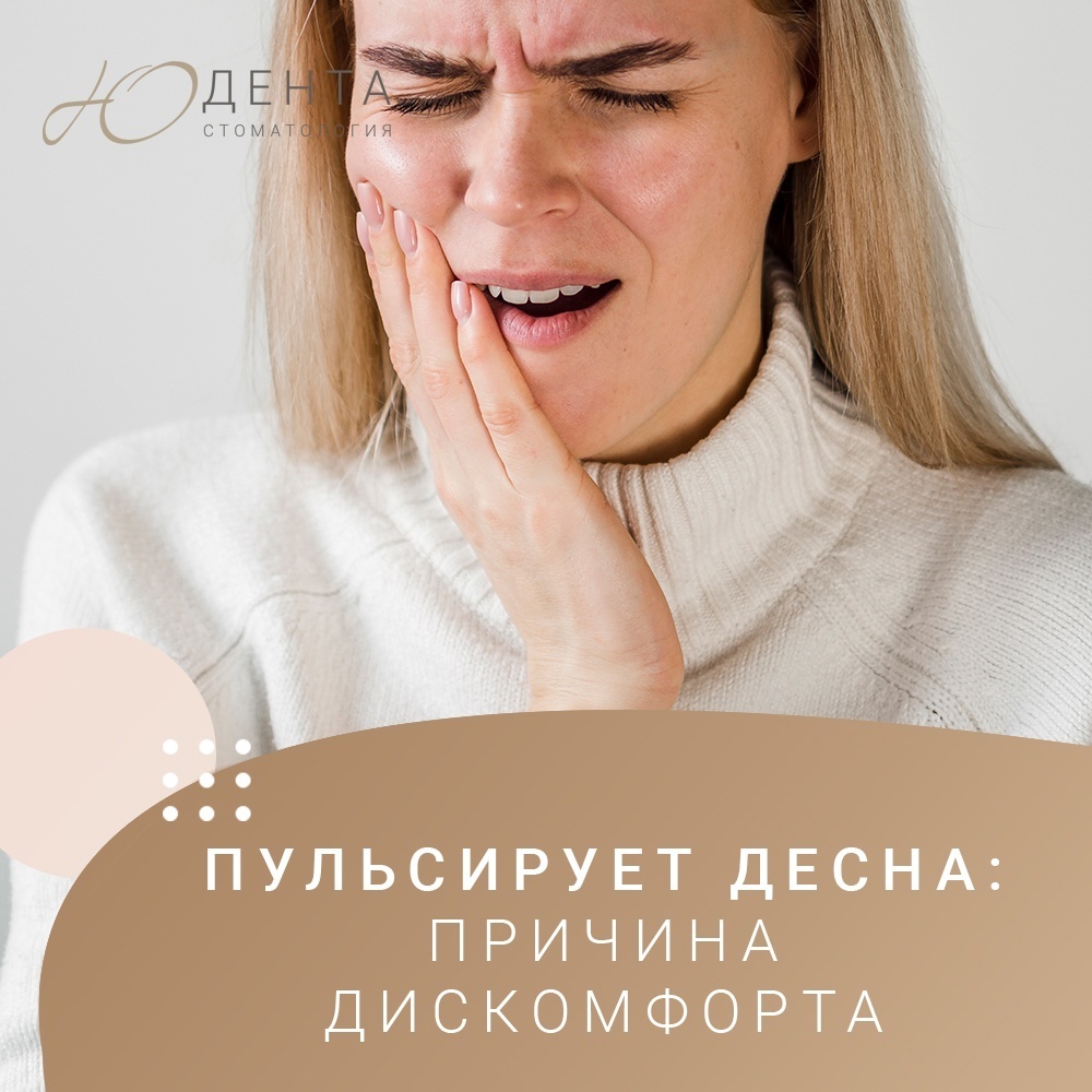 Пульсирует десна: причина дискомфорта и что делать? Пульсация в десне — тревожный симптом, который может сигнализировать о воспалении и других стоматологических проблемах. Разберёмся, почему это происходит и как правильно действовать. Почему может пульсировать десна? 🔹 Воспаление – гингивит, пародонтит или абсцесс могут вызывать отёк и неприятные ощущения. 🔹 Кариес и его осложнения – если воспаление распространилось на корень зуба, возможны пульсирующие боли. 🔹 Травма – ушиб или повреждение десны могут вызвать её раздражение и отёчность. 🔹 Зуб мудрости – его движение или неправильное положение могут привести к воспалению десны. Что делать, если десна пульсирует? 🔸 В первую очередь обратитесь к стоматологу – если десна пульсирует и боль не проходит, важно как можно скорее выявить причину и начать лечение. А до визита к врачу можно: 🔹 Провести гигиену – аккуратно почистить зубы и прополоскать рот антисептическим раствором. 🔹 Не прогревать – тепло может усилить воспаление. 🔹 Приня