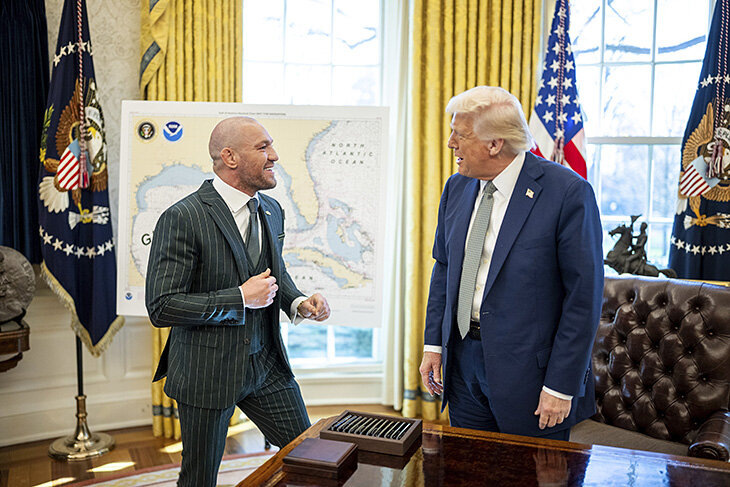 Конор Макгрегор неожиданно появился в Белом доме и встретился с президентом США Дональдом Трампом. Многочисленные обвинения в сексуальных насилиях не стали помехой для визита, ведь Трамп любит Конора.
