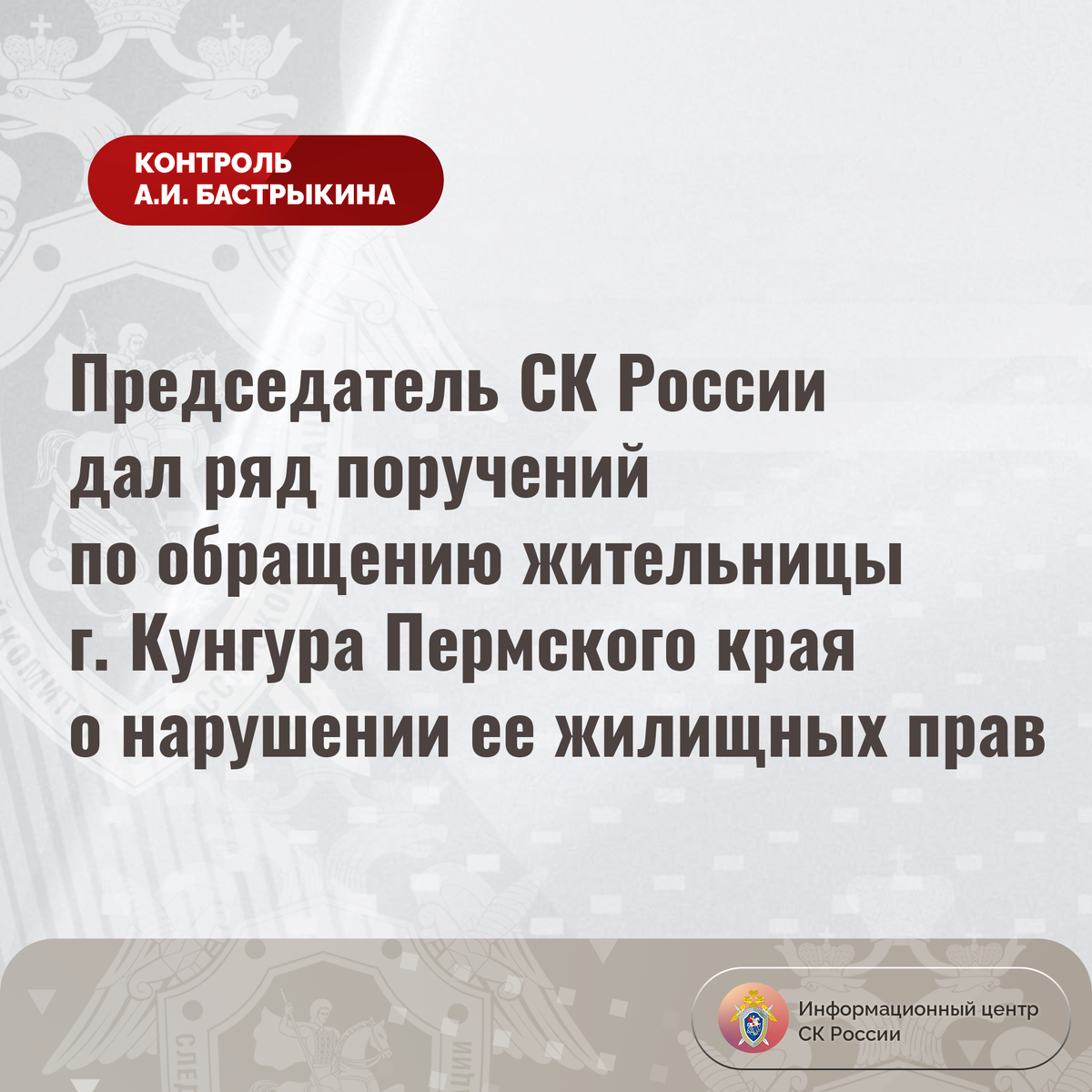 Председатель СК России дал ряд поручений по обращению жительницы г. Кунгура Пермского края о нарушении ее жилищных прав К Председателю СК России А.И. Бастрыкину в его приёмную «ВКонтакте» обратилась жительница города Кунгура Пермского края по вопросу нарушения ее жилищных прав. Более 10 лет назад на основании договора социального найма женщине и ее семье предоставлена квартира в доме, 1961 года постройки, по улице Солнечной, которая в мае 2023 года признана непригодной для проживания. В феврале прошлого года в здании произошел обвал опорной части нескольких деревянных балок, устранить который не представилось возможным из-за угрозы обрушения несущих конструкций. В том же месяце судом на администрацию возложена обязанность предоставить семье заявительницы во внеочередном порядке иное благоустроенное жилье, однако до настоящего времени решение не исполнено. Кроме того, несмотря на признание в декабре прошлого года строения аварийным, мер к его расселению не принимается. Многочисленные об