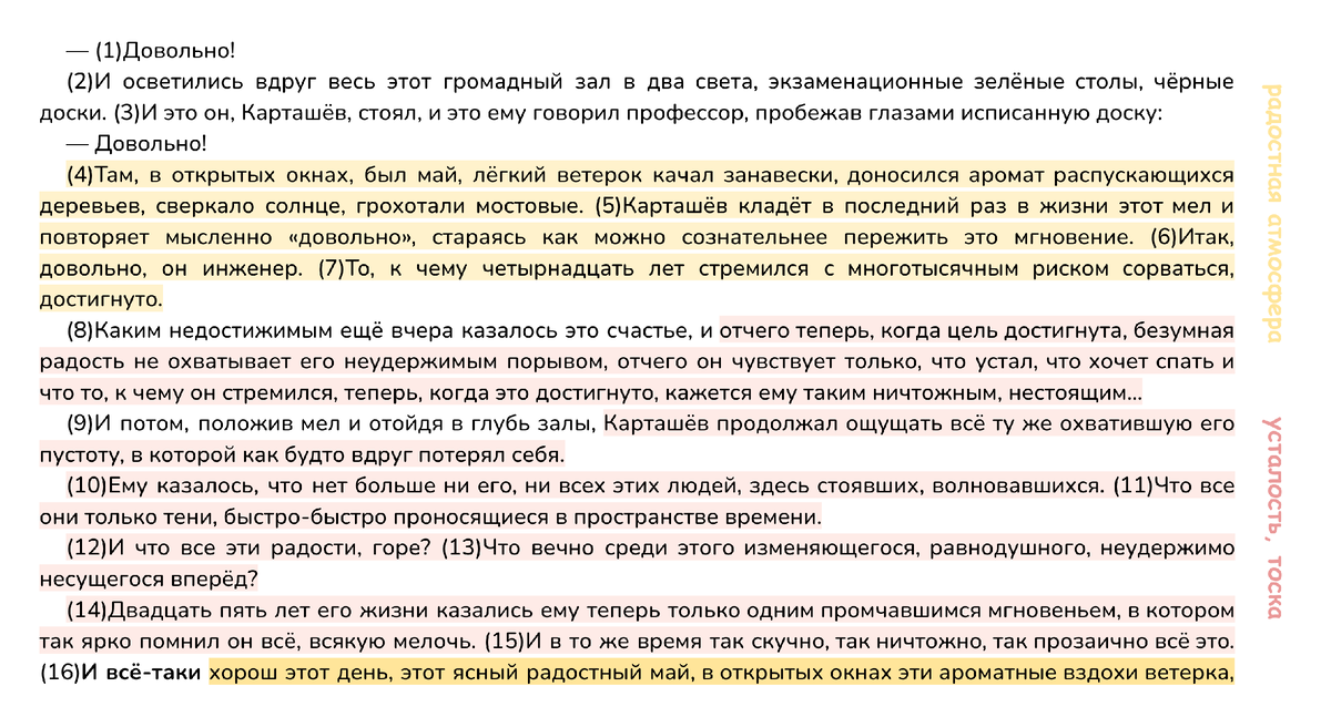 Второй пример дополняет первый: Карташёв не только переживает смутную тоску, усталость, тревогу из-за перемен в жизни, но и ощущает гордость собой, радость из-за долгожданного исполнения мечты, предвкушает новые свершения.
