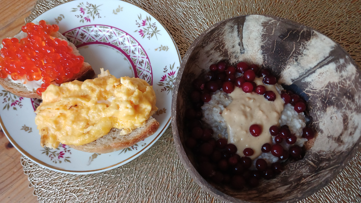Сегодня доедательный день. Освобождаю холодильник. На завтрак овсяная каша со стандартным в последнее время набором добавок - арахисовая паста и ягоды (брусника). Скрэмбл и бутерброд с икрой на домашнем французском хлебе. На обед доели куриный суп-лапшу и к ней - сборная тарелка (последняя кроличья котлетка, нарезка сальчичона, несколько куриных желудочков, айсберг и бутерброд с икрой) Потом кофе попила с тортиком на ужин доели оливье и закусочный Наполеон Меню год назад