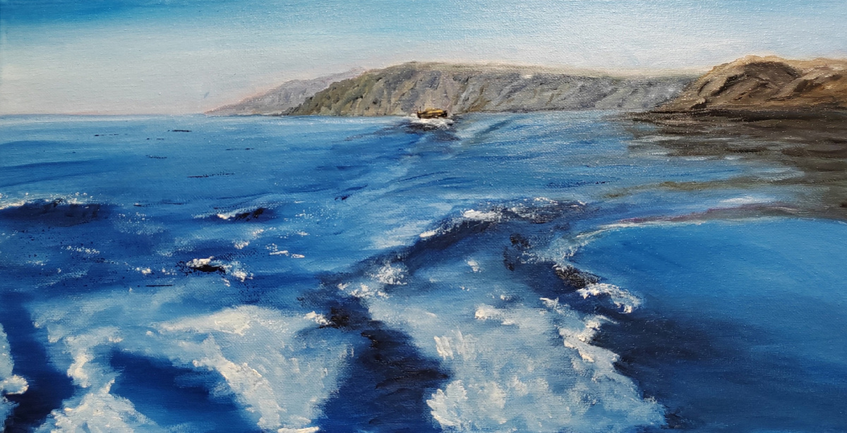 Художник ОКСАНА КАЛИНА (Калинина Оксана Яковлевна) хотя и живёт в г. Невинномысск Ставропольского края, но родилась она в Иркутске и прожила там много лет, поэтому совершенно справедливо считает те края своей малой родиной, и, конечно же, озеро Байкал является для неё родным. Байкал никого не может оставить равнодушным. Своё творение, творение души и сердца, Оксана назвала так: "Прогулка по Байкалу". Эта картина участвовала в выставке в Сербии (зарубежная выставка). Холст на подрамнике 50х25 см. Масло.