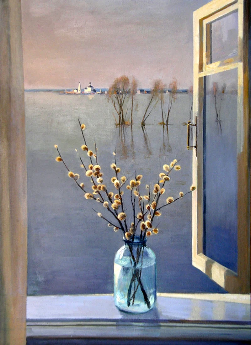 Мощный разлив реки – вода от от самого окна и до другого берега, где церковь. Церковь похожа на чудесный остров между небом и землей. Распахнуто окно навстречу теплому воздуху, солнечному свету и, наверное, колокольному звону. Сияют на свету золотистые шишечки вербы. Очень светлая и благостная картина.