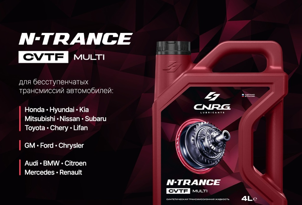 В ассортименте CNRG появилась новинка, которую ждали многие: специальная синтетическая жидкость для вариаторов, которая прекрасно подойдет для большинства моделей современных американских, азиатских и европейских автомобилей. В чем преимущества нового продукта? Каким требованиям он соответствует? Ответы на эти вопросы вы найдете в этой статье. Примерно 20% легковых автомобилей, которые сегодня ездят по территории нашей страны, оснащены вариантными коробками переключения передач. А это более 9 000 000 автомобилей (по данным аналитического агентства «Автостат» — в России на текущий момент зарегистрировано почти 47 миллионов легковых машин). Интересный факт: для обслуживания такого количество автомобилей по предварительным подсчетам требуется 17 000 000 литров жидкости для CVT в год. Необходимость в качественном и надежном трансмиссионном масле для вариатора крайне высока. Поэтому мы представляем новинку — трансмиссионную жидкость N-TRANCE CVTF Multi. Синтетическая трансмиссионная жидкост