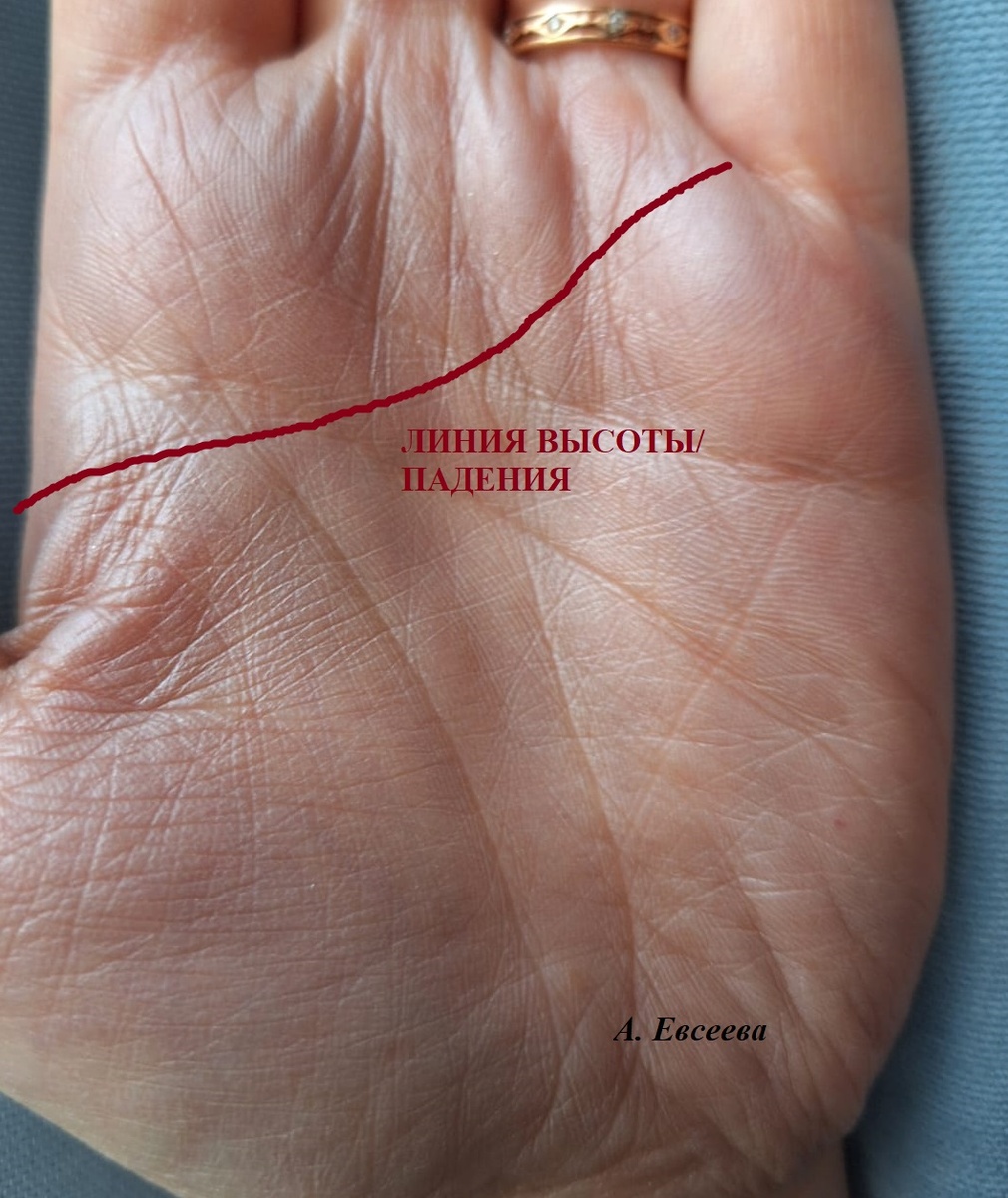 Сама работа и общение с единомышленниками подкидывает интереснейшие темы для освещения в блоге. Благодаря моему начинающему коллеге Евгению и его практике, разберем сегодня интересный и хорошо отрабатывающий знак - ЛИНИЯ ВЫСОТЫ. Он встречается нередко на руках. Конечно не у каждого второго, но чаще прочих редких знаков. ЛИНИЯ ВЫСОТЫ / ПАДЕНИЯ - это диагональная линия, начинающаяся в межпальцевом пространстве Безымянного пальца и Мизинца и тянущаяся к основанию Большого пальца в зону холма Марса отрицательного. Данная линия может быть четкой и ярко выраженной, бывает штриховидной, двойной, а бывает тонкой и еле различимой. Знак Линия Высоты говорит о том, что у его обладателя есть риски травм, связанных с падением, с ударами и высотой в том числе. У меня на обеих руках есть такие линии. Однако они отличаются. На левой этот знак явный и четкий, на правой крайне слабо выражен. С детства я не боялась высоты. Все деревья рядом с домом моей бабушки были моими) Мы с друзьями играли в дог