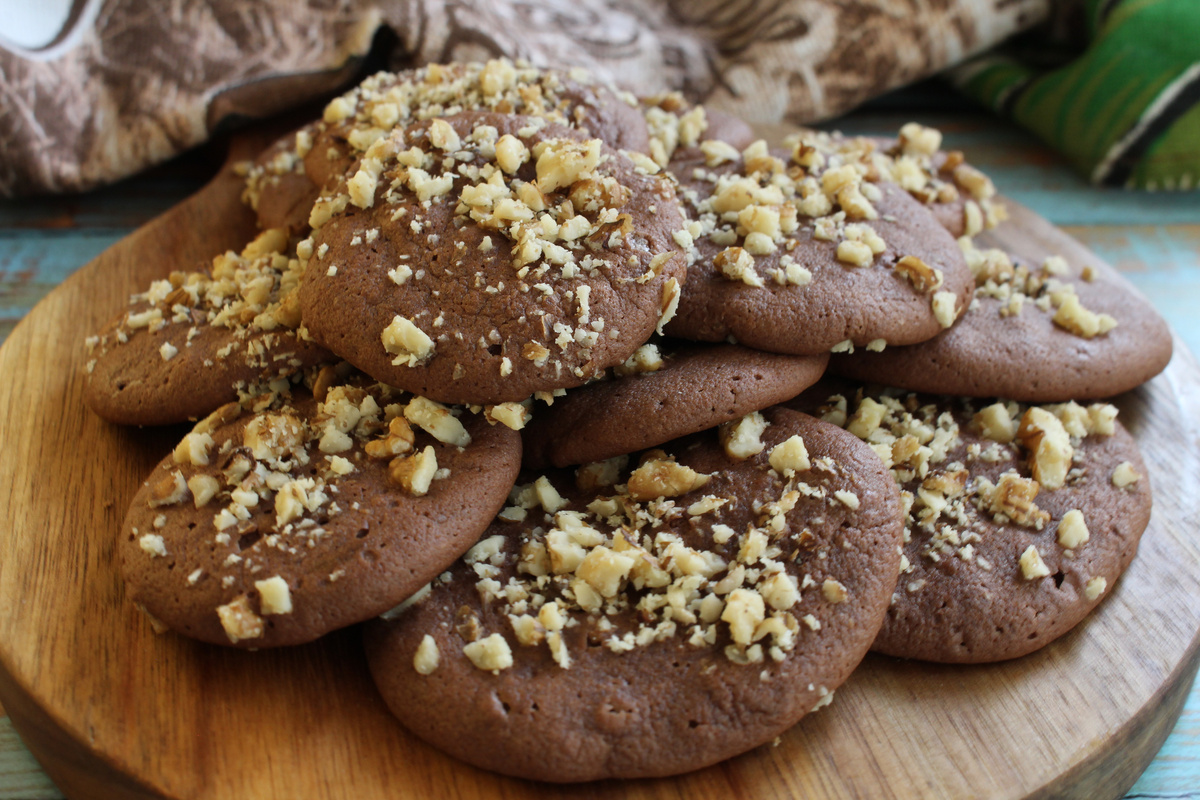 Это печенье будет готово у вас за 20 минут. Тут не надо растирать масло и ждать когда оно согреется, не надо раскатывать тесто или лепить печенье. Все делается действительно быстро и легко. Вы даже не запачкаете руки. Печенье получается нежное, мягкое, вкусное и очень шоколадное. Этот рецепт понравится любителям шоколадных десертов. Орехи для приготовления можно использовать совершенно любые, которые вы любите. В тесто можно добавить ванильный сахар или ванильный экстракт, но мне кажется, что аромата, который дает шоколад, вполне достаточно. Шоколад горький - 200 г. Масло сливочное - 50 г. Яйцо куриное - 2 шт. Сахарная пудра - 150 г. Разрыхлитель - 1 ч.л. Соль - щепотка Мука - 80 г. Орехи грецкие для украшения Включите сразу духовку, тесто будет готово быстро. На водяной бане растопим шоколад со сливочным маслом. Я растапливаю не на бане, а просто на небольшом огне, постоянно помешивая. Уберем посуду с огня и даем немного остыть. Я особо тесто не остужаю, просто пару раз перемешиваю и