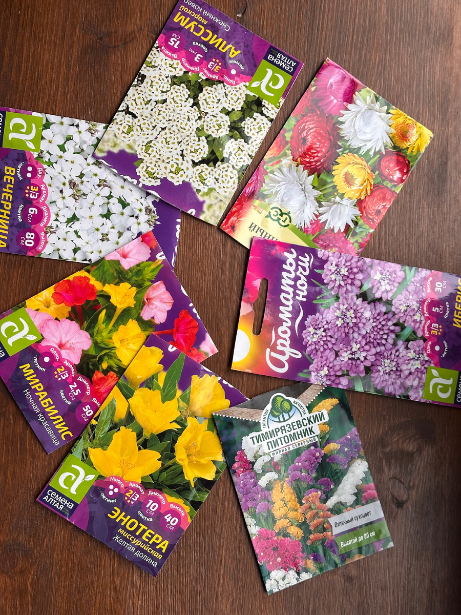 Я— человек, который воспринимает мир через запахи. И в прошлом году я поняла, что в моём саду катастрофически не хватает ароматов. Жасмины быстро отцвели, оставив воспоминания и тлю на ветках, сирень радует вторую весну всего одним соцветием, сорта роз и петунии я высадила практически с отсутствием аромата. В моей ароматеке воспоминаний есть особый файл. Он называется «Южное деревенское детство». Там всё: аромат сена, магазин с подовым хлебом, земля после дождя и, конечно, ночная фиалка. Этот нежный, сладковатый запах, который окутывал всё вокруг, как тёплое одеяло. Я решила: хочу это обратно! Итак, план был прост: 1. Найти семена ночной фиалки 2.Вырастить 3. Наслаждаться ароматом. Но, мне повезло (хочется верить) больше, мне попался набор семян из серии «Ароматы ночи» от «Семена Алтая». Набор шикарен: энотера, душистый табак, алиссум морской, иберис, мирабилис и, конечно, она самая — вечерница матроны, она же ночная фиалка. Иберис я решила буду сеять сразу в почву, потому