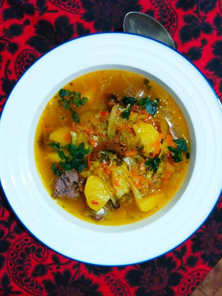 За десятилетия жизни с таксами, Михалваныч приучился никогда не есть варёное мясо без спроса) Жареное и всяческие гуляши он ест, а про варёное всегда спрашивает - мясо можно брать или это собакам? Сегодня, так и быть, и Михалванычу досталось) Щи из свежей капусты варила сама, Ленка снова шлялась по полю и добывала дичь. Полтора часа таскалась, и погода ей нипочём. Щи из молодой капусты, с лисичками. Я очень люблю красивые, ароматные и насыщенные бульоны. * Для щей я взяла - Пол кило обрезных свиных рёбер, косточка и немного мяса на ней, для навара Пол кило говяжий грудинки Примерно 300 гр говядины дарницкой. Все тщательно вымыла, сложила в кастрюлю и залила почти что тремя литрами воды. Очень тщательно сняла пену. Добавила нитку сушёных грибов лисичек, немного соли, прикрыла крышку, убавила нагрев и оставила бульон вариться, до готовности мяса. 1 морковь 1 репчатую луковицу Мелко измельчила, морковь на тёрке. И спассеровала на сливочном масле. Масла взяла примерно 50 - 70 гр. 2