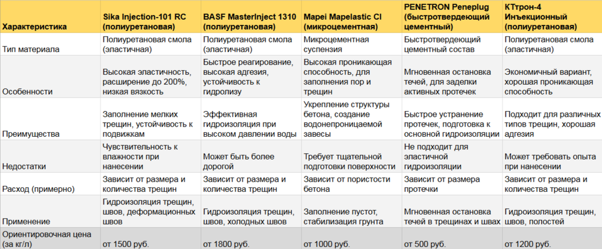 Рассмотрим некоторые популярные бренды и их материалы для инъекционной гидроизоляции, представленные на российском рынке: