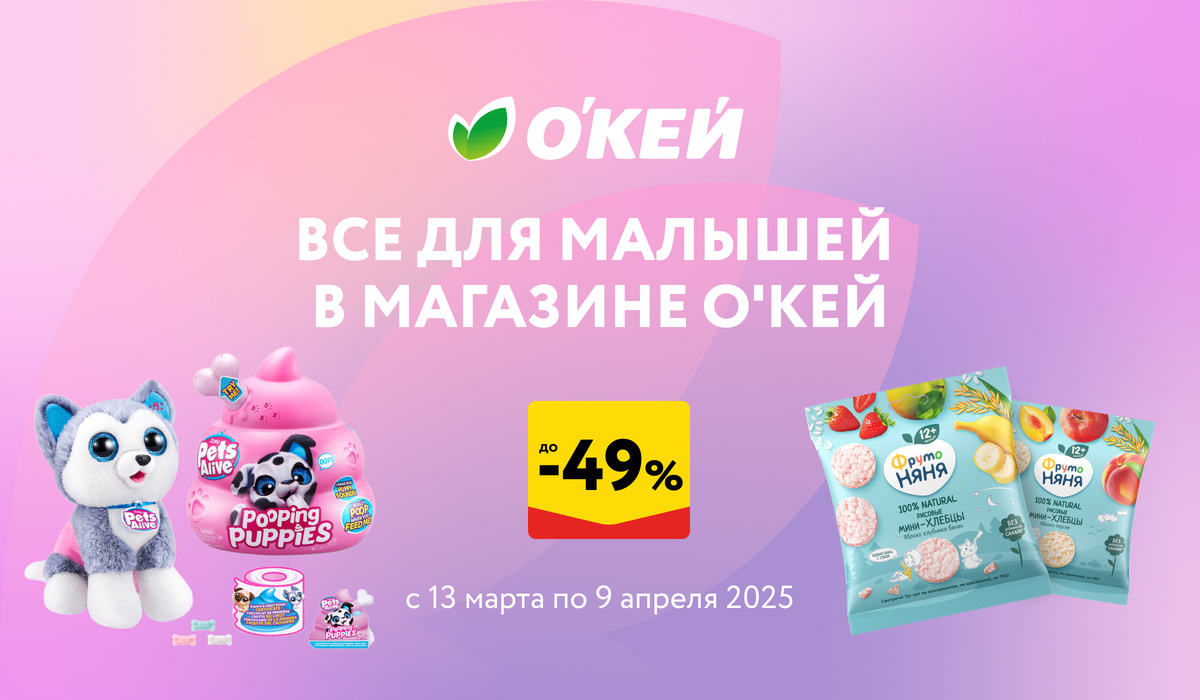 Покупатели не раз могли убедиться в том, что О'КЕЙ относится к ним с любовью и заботой. Поэтому сегодня на повестке дня «семейные» скидки, которые будут в помощь родителям малышей. Объявляем акции на товары для детей разных возрастов – от грудничков до ребят дошкольного возраста. С 13 марта по 9 апреля вы сможете приобрести детские продукты питания, средства для ухода и гигиены, игрушки и одежду по сниженной цене – 15-67 процентов. Чистота и здоровье кожи Гигиена – один из главных факторов здоровья и гармоничного развития малыша. Детская кожа слишком чувствительна и реагирует буквально на все воздействия, будь то естественные выделения, вода, моющие средства, ткань одежды. Вот почему мы уделили особое внимание линейке товаров, отвечающих за чистоту. Причем у нас есть средства гигиены как для малышей, так и для мам, ведь они тоже нуждаются в заботе. Вот товары, которые имеет смысл купить побольше и надолго: • Влажные салфетки Pamperino, LOVULAR, Aura и влажная туалетная бумага Mon Rulo