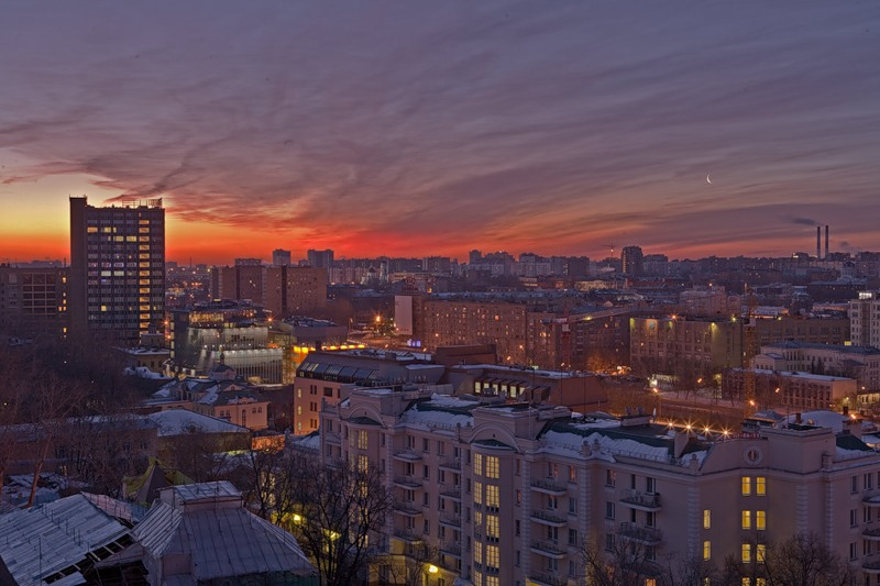 Оторвавшись от грустных мыслей, старик встал и подошёл к окну. Низкие, тёмные тучи, с утра затянувшие небо, рассеялись. Широкой, яркой полосой горел тревожный малиновый закат. В комнату лениво вползали ранние зимние сумерки.