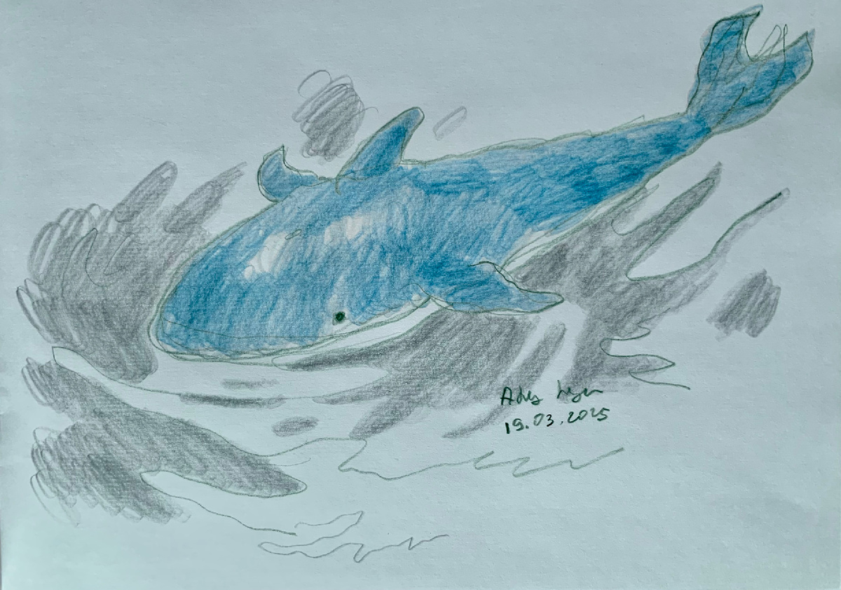 В поисках родных он продолжал слать сигналы вглубь и вширь моря. Поднималась рябь на воде. Тучи бросали тень на его кожу. Пищали дельфины. Но он не отвлекался на них. У него есть цель. Жар солнца и холод ветра? Это не остановит его. Он знал — там внизу подлодки. Не глушите мои сигналы! Он рвется вперед. Вдаль прекрасного моря. Скоро ли он найдет свою семью? 🐋