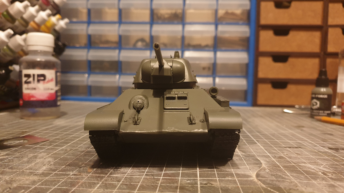 Приветствую вас, уважаемые подписчики и зрители! Сегодня мы покрасим модель танка Т-34/76 УЗТМ, Перед покраской наносим на модель грунт, в моём случае это был зелёный грунт от "Vallejo". Следующим шагом окрашиваем траки и бандажи опорных катков в чёрный цвет. После высыхания чёрной краски наносим основной цвет - краска цвета "Защитный серовато-зелёный" от "Pacific". После нанесения основных цветов делаем потёртости методом сухой кисти, для этого используем краску XF-56 от "Tamiya", танк будет довольно новым, но я всё равно решил сделать немного потёков с помощью масляных красок, для этого использовал краски цвета жжённая умбра и жёлтый, краску наносим на модель маленькими точками, после чего, движениями сверху вниз растушевываем её с помощью плоской кисти смоченной в разбавителе. Последним шагом наносим на танк пигмент "Тёмная почва" от ARM.PNT. Теперь закончим работу над диорамой, на поверхность диорамы наносим текстурную пасту, после чего посыпаем поверхность землёй. После высыхани