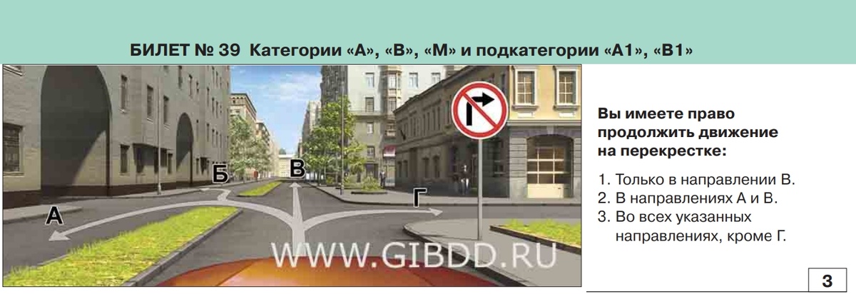 Рассмотрим очередной ляп от их авторов. Билет 39, вопрос 3. В комментариях мы видим следующее: "Из четырех предложенных направлений Вы можете двигаться толь ко в двух — А и В. Поворот направо на перекрестке (на правление Г) запрещен знаком 3.18.1 «Поворот направо запрещен». При движении в на правлении Б Вы оказались бы левее разделительной полосы, т.е. на проезжей части, предназначенной для встречного движения (п. 1.4). Ответ — 2". Ссылаясь на п. 1.4 ПДД РФ, указывающий на то, что на дорогах установлено правостороннее движение транспортных средств и на то, что оказавшись левее разделительной полосы Вы окажетесь на встречке, автор не учел один момент. Разделительная полоса, по определению, разделяет смежные проезжие части и вовсе не обязательно встречные, но и попутные. И перекрестки тоже бывают разные. Пример ниже. Так что при выполнении маневра по траектории Б вы вовсе не обязательно окажитесь на встречке. Так знание чего в итоге проверяет этот вопрос билета? Знака 3.18.1? Его тре