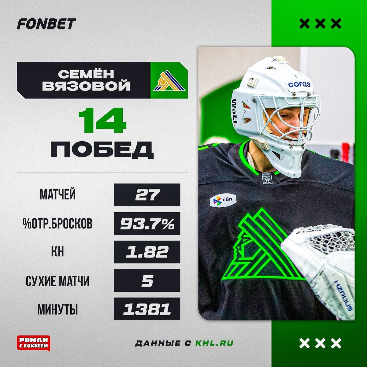 Понимаю, что есть потрясающий Иван Демидов, но и выступление Семёна Вязового заслуживает восхищения Молодой вратарь, драфтованный «Сиэтлом» под 163 номером в 2021 году, в этом сезоне провёл 27 матчей за «Салават Юлаев», в которых одержал 14 побед, из которых ещё в 5 сыграл на «0». А коэффициент надёжности при этом составил солидные 1.82 Семён не просто здорово исполняет функции бэкапа, но ещё и делает это на уровне лучших вратарей лиги. Например, по коэффициенту надёжности он идёт следом за Даниилом Исаевым: Даниил Исаев («Локомотив») — И 39, КН 1,65 Семён Вязовой («Салават Юлаев») — И 27, КН 1,82 Алексей Мельничук («Локомотив») — И 27, КН 1,89 Владислав Подъяпольский («Динамо» Москва) — И 42, КН 2,04 Александр Смолин («Металлург») — И 25, КН 2,06 Да, матчей у него сыграно меньше, чем у других вратарей в этом ТОПе, но 27 игр — это довольно приличная выборка. И по проценту отражённых бросков Вязовой также находится в топ-2 всей Лиги: Владислав Подъяпольский («Динамо» Москва) — 9