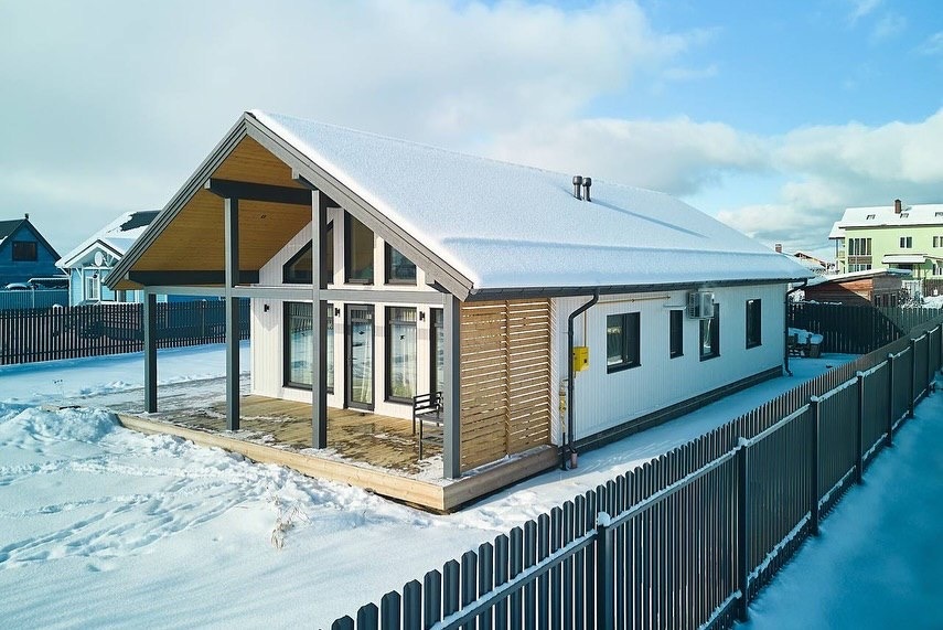 Это уютный каркасный дом, построенный с учетом современных требований к комфорту, энергоэффективности и удобству для жизни семьи. Он представляет собой комплексный проект, реализованный «под ключ» — от фундамента до полной внутренней отделки. Этот проект задумывался как компактный, но при этом очень функциональный дом для семьи из трёх человек. Фактически дом разделён на 2 зоны: приватную и общую. Приватная зона включает две детские комнаты, спальню хозяев с гардеробной, санузел, совмещённый с сауной и выходом на террасу. Постирочная объединена с котельной. В общей зоне находится гостиная, объединенная с кухней и столовой. Высота потолков здесь достигает 5,4 метров, что создаёт ощущение простора. Большие панорамные окна обеспечивают максимум естественного света, а широкие карнизные свесы защищают дом от перегрева летом. Когда выбор стоит между сауной в доме или отдельно стоящем здании, то в целях экономии можно выбрать первый вариант (800 000₽ с отделкой против 2-3 миллионов).