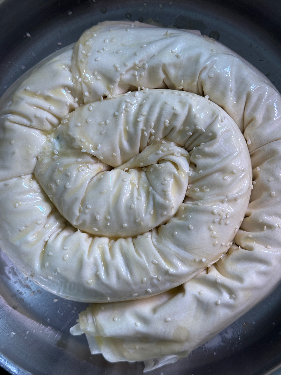 Доброго вечера! Сегодня я к вам с рецептом интересного пирога-улитки. За основу взят рецепт Марии Шелушенко. Оригинальная задумка лично для меня была слегка суховата, поэтому я увеличила объем начинки и добавила томаты. 3. Тесто фило необходимо заранее достать из морозилки, чтобы оно разморозилось и было готово к скручиванию рулетика. Внахлест 2-3 см складываем в длинную дорожку по 2-3 листа фило. Вдоль длинного края выкладываем колбаску начинки и скручиваем в единый рулет. Из рулета формируем спиральную улитку и отправляем в форму, смазанную маслом. 4. Улитку смазываем растопленным сливочным маслом и посыпаем кунжутом. Отправляем запекаться в разогретую до 180 градусов духовку на 30-40 минут до зарумянивания. Примечание: если добавить слишком много белка, то масса может немного выплыть из пирога, но на вкус это не повлияет. И, конечно, разрез: Приятного аппетита! Спанакопита, пирог-улитка, рецепт сытного пирога, рецепт с тестом фило, тесто фило, сытные рецепты, готовим дома, вкусные