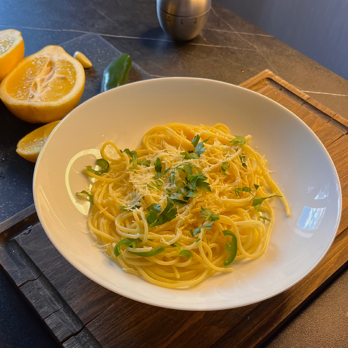 Недавно я наткнулась в интернете на нечто удивительное — рецепт лимонной пасты. Честно говоря, до этого момента я даже не подозревала, что паста может быть такой необычной! Лимон, чили, чеснок — звучит интригующе, правда? К счастью, рецепт оказался настолько простым, что я решила сразу его опробовать. И знаете что? Это было быстро, вкусно и с приятной остринкой! Делюсь с вами этим открытием — возможно, вы тоже захотите разнообразить свои кулинарные будни. - Паста (любая на ваш вкус) — 150-200 г - Чеснок — 1 зубчик - Перец чили — 1 шт. (я взяла длинный зелёный и использовала половину) - Лимон — 1/4 шт. - Сливочное масло — небольшой кусочек (около 20-30 г) - Оливковое масло — 1-2 ст. л. - Пармезан — по вкусу (натёртый) - Петрушка — несколько веточек - Вода из-под пасты — 4 ст. л. - Соль — по вкусу 1. Подготовка пасты Отварите пасту в подсоленной воде до состояния аль денте (чуть твёрдая внутри). Не забудьте сохранить 4 столовые ложки воды после варки — она пригодится для соуса.