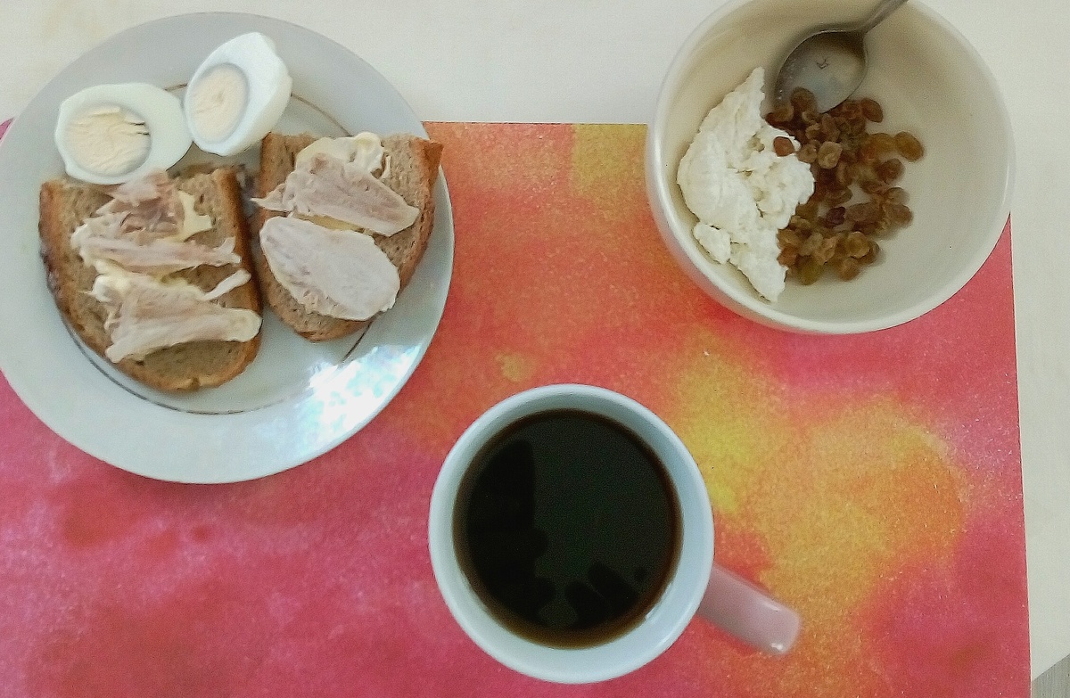 Добрый вечер!Чем я вчера вечером отвела от себя аппетит? я съела яблоко. и отпустило. Сегодня все по плану,даже творог,изюм и галеты съела по половине.Завтрак: брускетта,голень отварная,помидор,твороги изюм.Обед: макароны,отварная курица,соуса сделала чуть по больше.Полдник:галеты,изюм,компот. Ужин:капуста,морковь,помидор,яйцо и отварной минтай,полито аджикой. Хорошего вечера.