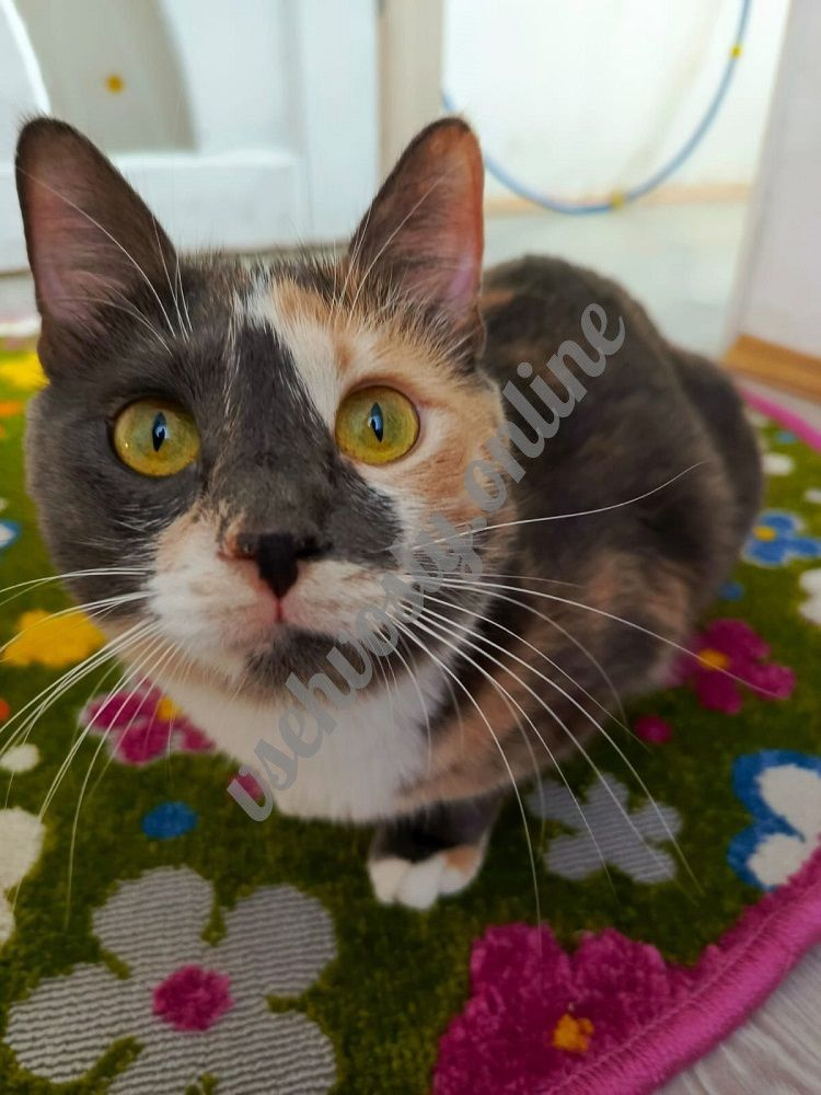 Юми обладает аристократичной внешностью - яркие большие глазки, маааленький носик, необычный окрас (осветленный калико), шерсть как у горностая.