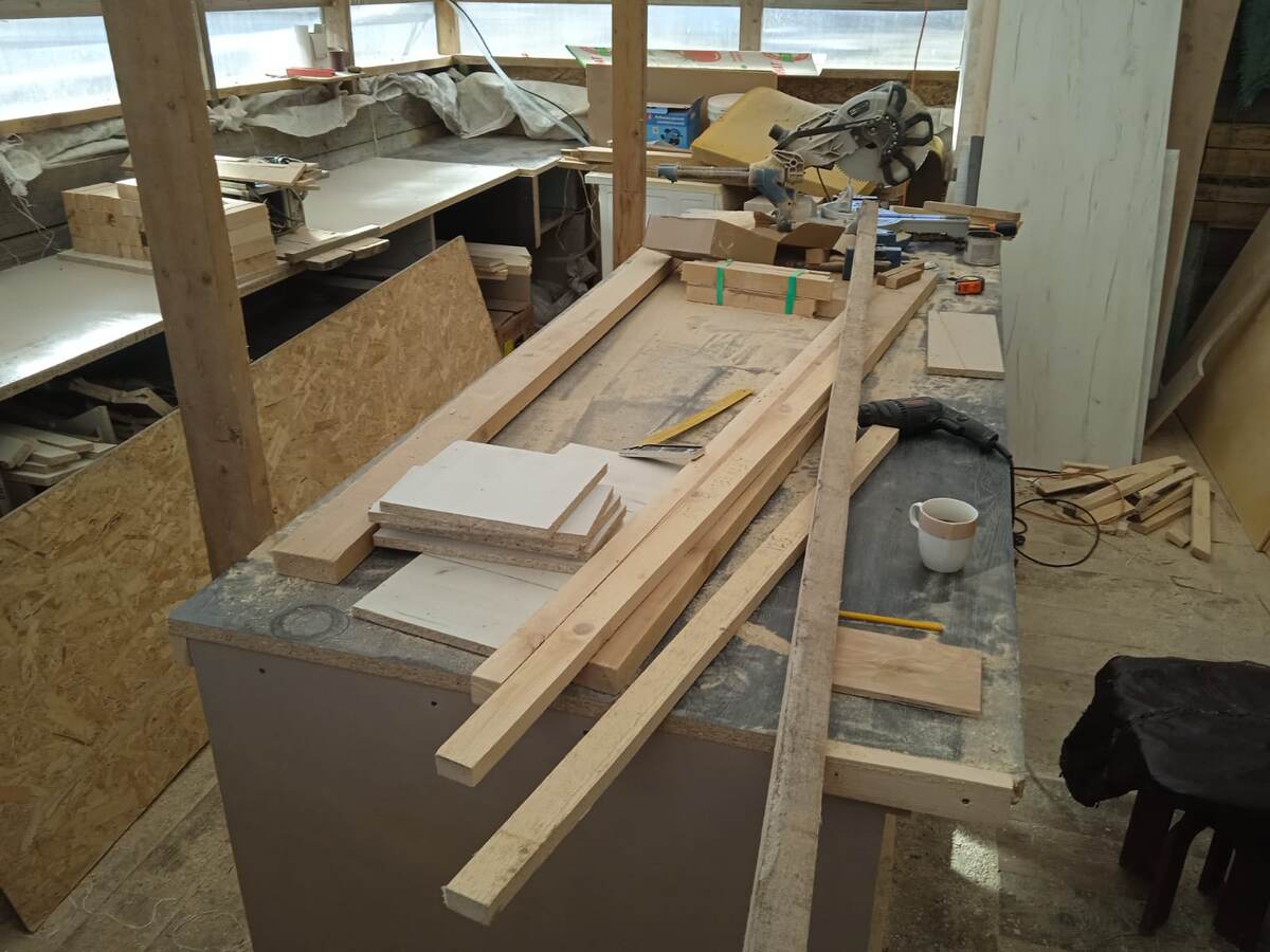 Изготовление деталей для мебели неизбежно приводит к появлению массы всевозможных обрезков, выкинуть которые жалко, а слепить из них что-то стоящеее - надо думать и ручками потрудиться. И вот, глядя на растущую кучу всяких фанерок, ДСПшек, штакетинок, решил я наконец попробовать изготовить концептуальную модельку подставки для комнатных растений. Такой вот у меня теперь верстачок и такие вот остатки материалов. А это - еще один параллельный эксперимент. Как из ничтожных обрезков фанеры попробовать сделать.... не ничтожные обрезки фанеры. К этому вопросу мы вернемся чуть позже. Постепенно в результате нехитрых манипуляций с рубанком, всякими пилами, дрелью и шуруповёрткой получается некое сооружение.... И вот как это сооружение выглядит на момент написания статьи. Его надо еще покрасить и уж тогда начать хвастаться друзьям - соседям. Ибо вещь в хозяйстве нужная. А с учетом пожеланий заказчика можно создать в принципе конструкцию любой сложности, формы и размеров