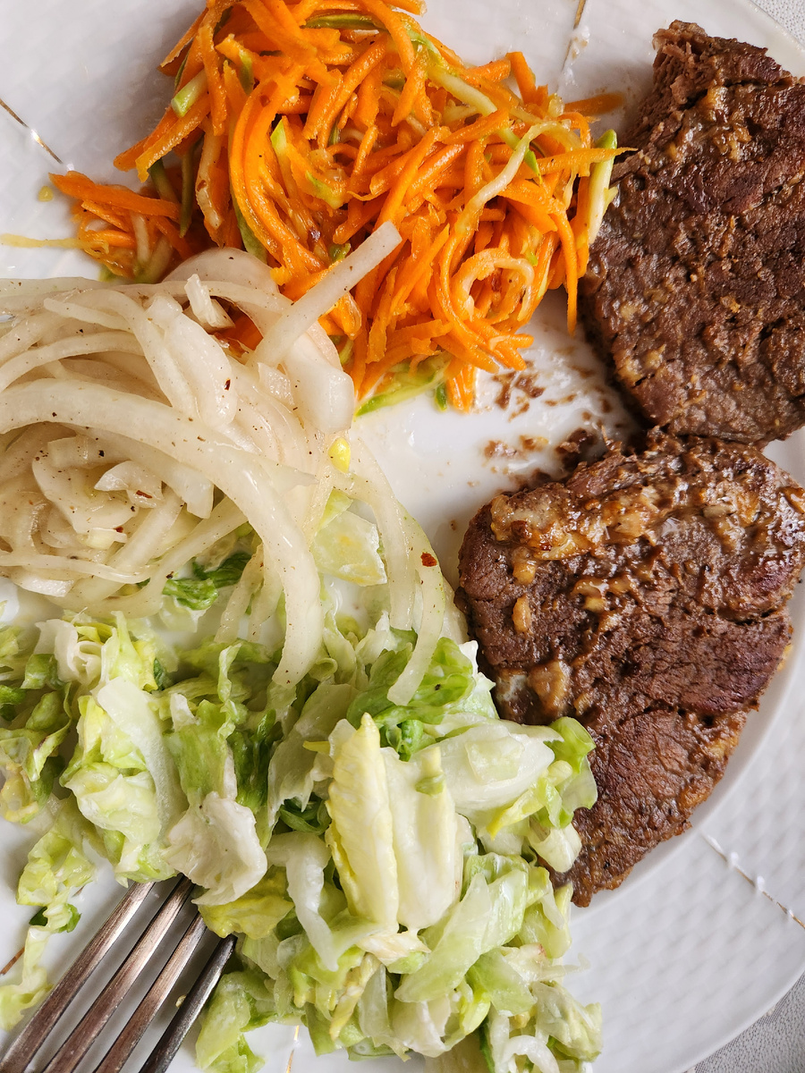 Добрый день, мои дорогие читатели. Пришли мы с мужем в воскресенье в магазин с идеей купить молодой белокочанной капусты. Ну той, которая немного дороже, чем зимняя. А ее и нет. Помидоры дорогие, огурцов типа ТСХА тоже нет и даже зелень вся вялая. И остановились мы в овощном ряду в задумчивости какой салат сделать для воскресного обеда. В итоге купили мы морковки, уж больно свежую ее вывезли и один маленький трехсот граммовый кабачок по 279 рублей. И соорудили дома такой салат: На терке для корейской моркови натерли большую свежую морковку и сырой кабачок. Кабачок не чистили, просто тщательно вымыли. Немного посолили и дали постоять. Выделившийся сок слили в миску, туда же добавили одну чайную ложку меда, одну столовую ложку яблочного уксуса, одну столовую ложку оливкового масла, щепотку черного молотого перца. Этот соус вылили обратно в морковку с кабачком, добавили еще немного соли. Дали постоять около часа в холодильнике. Получился вкусный, очень нежный салат. Я даже решила,
