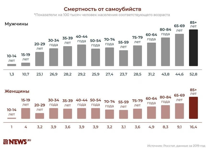 Чаще всего на самоубийства в России идут люди старше 85. Эта возрастная категория является антилидером на протяжении как минимум последних пяти лет.