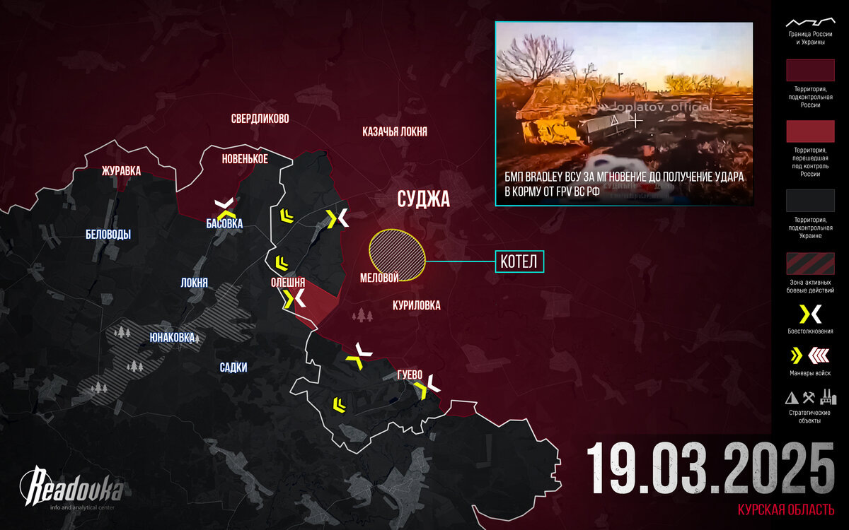 Редакция Readovka собрала самые важные события 19 марта в разрезе СВО. Русские войска продолжают успешно пресекать попытки ВСУ прорваться через границу Белгородской области. Президент России Владимир Путин в своем выступлении уравнял регулярные подразделения противника, действующие в Курской области, с наемниками, которым гуманное отношение, согласно Женевской конвенции, не гарантируется.. Вопрос времени ключевой Несмотря на то что украинские подразделения, понеся потери при попытке прорыва границы России на севере Белгородской области, не сумели добиться ее прорыва в глубину, противник не успокаивается. Ночь была неспокойной, неприятель обстреливал и дистанционно минировал территорию РФ, а на утро 19 марта вновь начал атаки на границу. Направления все те же – это населенные пункты Демидовка, Графовка и Прилесье. И опять ВСУ не смогли осуществить прорыв. Даже привлечение большего числа инженерных машин разграждения не сделало им картины. Как и предполагала редакция Readovka, Киеву не