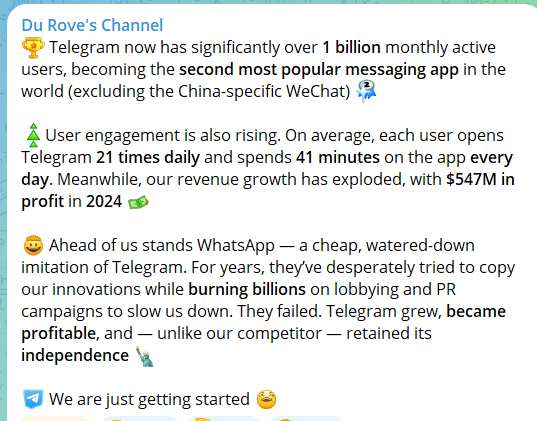 Источник: Павел Дуров Месячная аудитория Telegram превысила один миллиард активных пользователей, сообщил основатель мессенджера Павел Дуров. По его словам, Telegram стал вторым по популярности приложением для обмена сообщениями в мире (за исключением китайского WeChat). На первом месте перед Telegram стоит WhatsApp, который Дуров назвал «дешевой» и «разбавленной» имитацией своего мессенджера. «В течение многих лет они отчаянно пытались скопировать наши инновации, сжигая миллиарды на лоббистских и PR-кампаниях, чтобы замедлить нас. Они потерпели неудачу. Telegram вырос, стал прибыльным и — в отличие от нашего конкурента — сохранил свою независимость», — пишет Дуров. Также, как написал Дуров, растет вовлеченность пользователей. Он утверждает, что в среднем каждый пользователь открывает Telegram 21 раз в день и проводит в нем 41 минуту каждый день. По словам Дурова, прибыль в 2024 году составила 547 миллионов долларов. В апреле 2024 года Дуров в интервью американскому журналисту Такеру