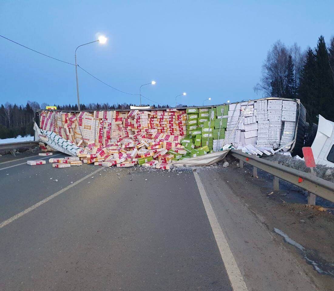 Водитель потерял контроль над управлением, грузовик занесло, после чего он опрокинулся на бок. К счастью, никто не пострадал. Но весь груз рассыпался на проезжую часть. ДТП произошло на 1002 км автодороги в направлении с. Карагай и Перми. Объезд организован через с. Менделеево, сообщает Госавтоинспекция Пермского края.