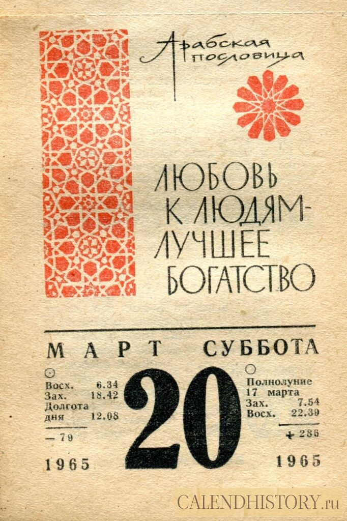 Итак, сегодня 20-го марта и у нас на календаре 1965-й год. Перед нами листок советского календаря для женщин. На календаре у нас суббота - 20 марта 1965-го года. Арабская пословица ЛЮБОВЬ К ЛЮДЯМ — ЛУЧШЕЕ БОГАТСТВО *** Оборотную сторону листка этого календаря можно посмотреть у нас по ссылке на сайте. Заходите на наш интересный сайт об отрывных календарях. Другие листки советских календарей смотрите у нас на сайте - CALENDHISTORY.ru ПОСМОТРИТЕ ЕЩЁ ЛИСТКИ ОТРЫВНЫХ КАЛЕНДАРЕЙ: