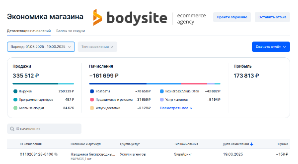 Маркетплейсы продолжают набирать популярность и кажется, нет предпринимателя, который бы не задумался о продажах на Ozon, Wildberries или Яндекс Маркет. На днях Ozon выкатил обновление привычного "Отчета по начислениям" и статьи начислений потерпели изменения. Порядок начислений стал сложнее, но точнее. В отчете теперь отображаются "Баллы за скидки". Баллы, которые Ozon начисляет за дополнительные скидки за свой счет, чтобы привлечь внимание к товару или бренду. Товары с дополнительной скидкой имеют значок "О" в личном кабинете. При продаже товара вы получаете свою полную цену. В справке маркетплейса на данный момент отсутствует подробная информация. Но служба поддержки помогает разобраться в обновлении. Мы давно и регулярно помогаем продавцам следить за своей рентабельностью и хотим дать вам инструмент, который упростит этот процесс. В этой статье мы рассмотрим особенности нового отчета и как использовать калькулятор Bodysite для расчета вашей прибыли. Для начала вам нужно зайти в ли