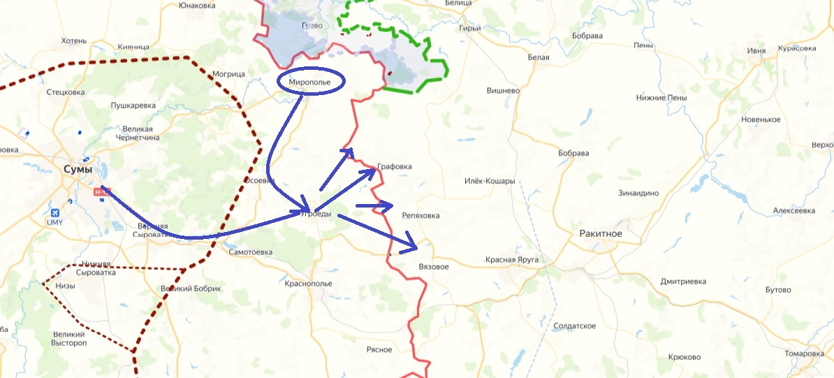 Пока один президент узнавал у другого на счёт заморозки линии соприкосновения, на границе Белгородской области происходила типичная провокация, к которым за три года мы уже привыкли. Та сторона обеспечивала переговорный фон, заодно хотела ещё себе козырей. Хотя это, наверное, при прошлой штатовской администрации могло сыграть кукую-то свою роль, при этой её даже не заметили. Теперь от внешнего фона ближе к земле. Тут было жарко. Вчера с самого утра противник пытался повторить свой заход, по типу того, что им удался в августе прошлого года на Курщину. Разница в том, что наши извлекли горький урок и на этот раз оказались готовы на все 100%. \ Для начала приведём карту района: Как видите, заход они попытались совершить совсем недалеко от того места, где наши их сейчас активно щемят. В этой связи есть несколько наблюдений. Во-первых, силы захода оказались из тех, кто успел или смог улизнуть из Курщины. Многие из них выдвинулись на точки из Мирополья, другие выдвинулись из областного центра