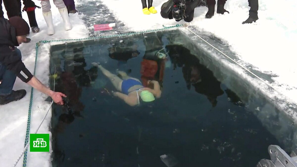 [ Смотреть видео на сайте НТВ ] Российская спортсменка Екатерина Некрасова установила новый мировой рекорд. Она проплыла подо льдом Байкала 122 метра, преодолев эту дистанцию за 1 минуту и 39 секунд. Спортсменка была без гидрокостюма, в купальнике и ластах. А температура воды в озере сейчас не превышает двух градусов тепла. После заплыва Екатерина призналась, что даже замерзнуть не успела. Прежнее достижение — 102 метра подо льдом — также принадлежало Некрасовой. Фестиваль фридайвинга «Под лед Байкала» проходит в Иркутской области во второй раз и привлекает десятки любителей экстремальных погружений в ледяную воду. [ Смотреть видео на сайте НТВ ]
