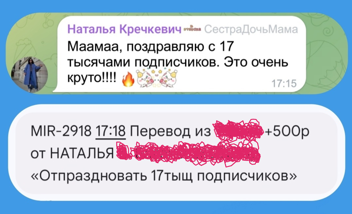 Потом дочь наградила меня "мороженым" в денежном эквиваленте. А потом она же перевела ещё столько же, чтобы "обмыть" мою семнадцатитысячную аудиторию 😁