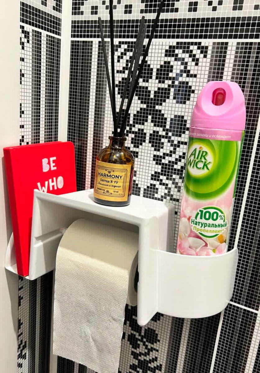 Первое, что попалось мне сегодня, — это оригинальный держатель для туалетной бумаги, который также включает в себя место для освежителя воздуха и небольшую полочку, на которой можно разместить книгу. Мне кажется, это действительно удачное решение для ванной комнаты. Такой аксессуар не только позволяет держать туалетную бумагу под рукой, но и добавляет стильный акцент благодаря встроенному освежителю воздуха.