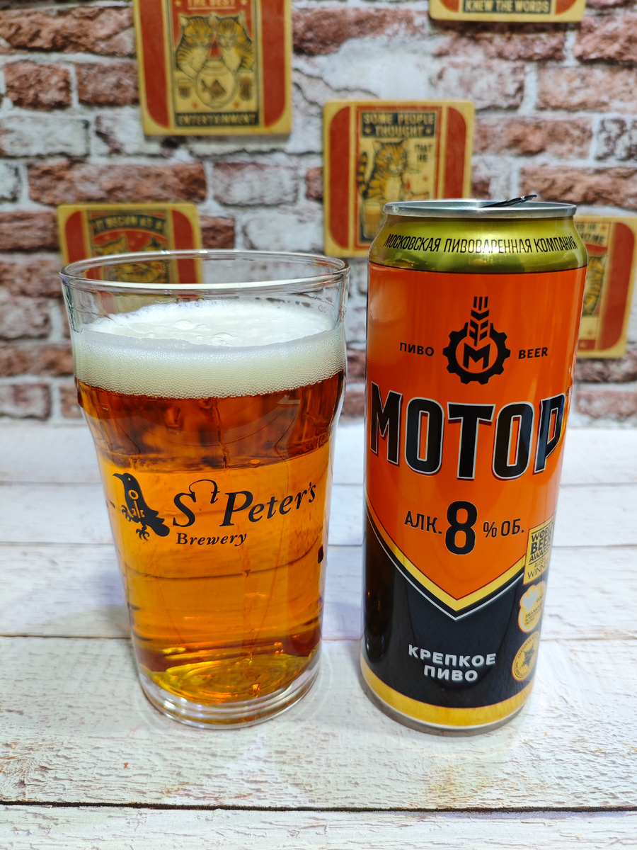 Крепкий лагер от Московской Пивоваренной Компании из г. Мытищи Московской области. На сайте пивоварни описание следующее: «МОТОР КРЕПКОЕ» — это светлое крепкое пиво с насыщенным вкусом и приятным хмелевым ароматом. Пиво с длительной выдержкой варится по традиционной технологии – только из отборного солода, ароматного хмеля и артезианской воды. ********************************************************************************** Плотность: 18%. Горечь: 16. Состав: вода питьевая, солод пивоваренный ячменный (светлый и карамельный), пшеница, хмелепродукты. Срок годности: 12 месяцев с хранением при температуре от 2℃ до +25℃. С даты розлива моей банки прошло чуть менее 4-х месяцев. ********************************************************************************** Пена в первые же секунды не спешит раствориться, но по итогу она сдалась и осталась крохами по краям бокала. Аромат слабый; чувствуется солод и эфирная фруктовость. С прогревом становится более выраженным и интенсивным; добавляется ощ