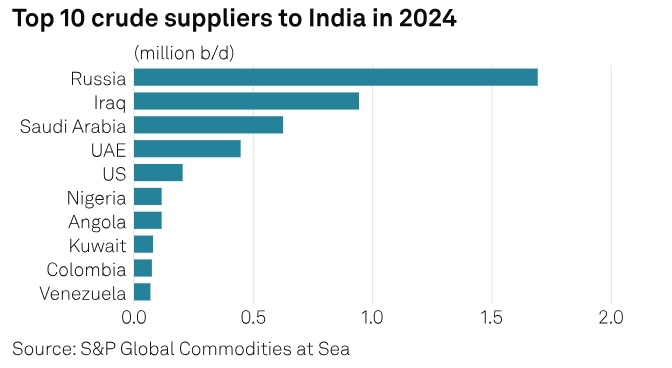 В 2024 году Индия стала свидетелем изменения в схеме поставок сырой нефти. Импорт с Ближнего Востока немного сократился, в то время как российская сырая нефть увеличилась, составив около 35% от общего объема импорта, который достиг около 4,9 млн баррелей в день. Хотя Индия продолжала получать меньшие объемы из таких регионов, как Латинская Америка и Африка, на Ближний Восток и Россию в совокупности пришлось почти 80% импорта сырой нефти в Индию.