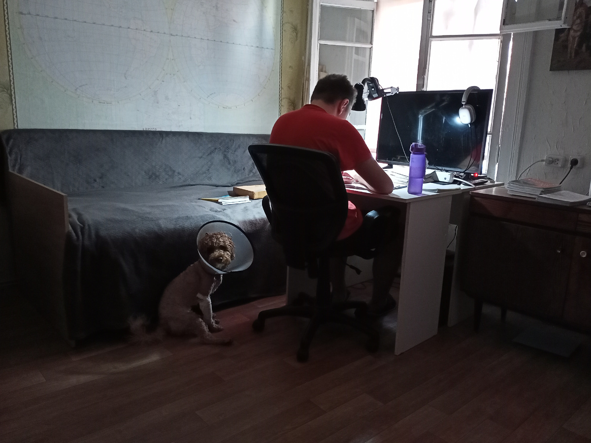 Миг (613). Булочка наша пострадала в неравном бою. Да, то, чего я боялась два года, случилось, на Румпеля напала и покусала собака. Наверное, из того, что могло случиться, произошло наименьшее, Румпелю в бедро воткнули клык и задели веко. И он даже, после этого, бегал и ловил мяч. Но за ночь началось воспаление, поднялась температура, а я даже не знала, что он на самом деле пострадал, следов не было, пока всё не опухло. В Румпеля навтыкали иголок, промыли раны, одну дырку от клыка в бедре, намазали, забинтовали, нацепили воротник "для его же блага" и отправили домой лечиться с наставлением "делайте перевязки". Звучит всё не так страшно. Но первый раз такое пережить было нервно. Не столько само событие,сколько встреча с первой болезнью собаки. Горячий пёс со спутанным сознанием и ты... А ещё я окончательно убедилась, что собака, которая хочет напасть, бесшумная. И первый удар ты не заметишь.... На Румпеля напала домашняя, милая "она не кусается" собака". И сделала она это так неожида