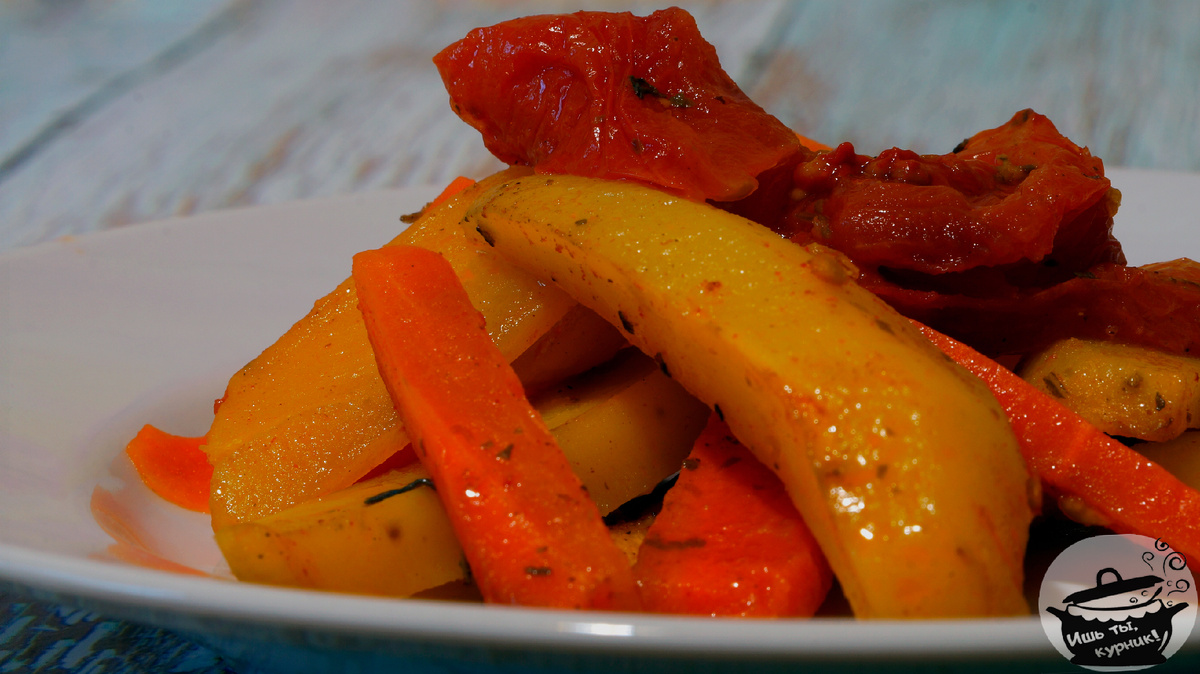 Ингредиенты: · картофель - 600 гр.; · морковь - 300 гр.; · помидоры - 300 гр.; · масло подсолн. - 1 ст.л.; · соль - 1 ч.л.; · паприка молотая копчёная - 1 ч.л.; · карри - 1 ч.л. Приготовление: помидоры порезать дольками, морковь и картофель очистить и порезать брусочками. Соединить овощи с маслом, специями, тщательно перемешать. Положить овощи в рукав для запекания, тщательно завязать края, сделать два маленьких прокола. Запекать в предварительно разогретой до 180° С духовке в течение 1 часа. Приятного аппетита!