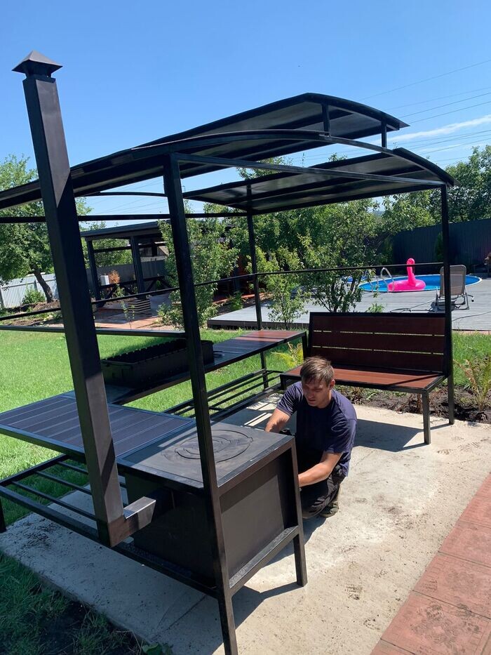 Мангальная зона. Резал металл на плазме. Рисовал в Компасе. Варили вместе с напарником. Обшита доской ДПК. Красил сам краскопультом. Организатор свадьбы захотел такую штуку. То что получилось. Этот заказ был без покраски, поэтому итогового вида нет. Тоже на свадьбу. Вроде похоже. Качель. Обувница домой из обрезков, а то сапожник без сапог выходит) Мангал с печью под казан. Мне вообще не понравилась задумка, я бы всё по-другому слелал, но это желание заказчика. На заднем плане станок плазменной резки. Заказчик попросил скрыть приямок с насосами возле бассейна. Здоровый шкаф из трёх секций. Разборный. Накладка на решётку радиатора квадроцикла. Каркас тента на прицеп. С пандусом для заезда квадроцикла. Очаг для костра. Спорная конструкция. Пока новый - ок, а потом все эти сеточки отгорят. Хотя прошло уже пол года, жалоб нет. Ну и сетку можно заменить при желании - выполнена съёмной. Просто шкафчики. Подстолье. Вес порядка 200 кг) Итоговый вид. Кстати столешница тоже около 150 кг) Каркас л