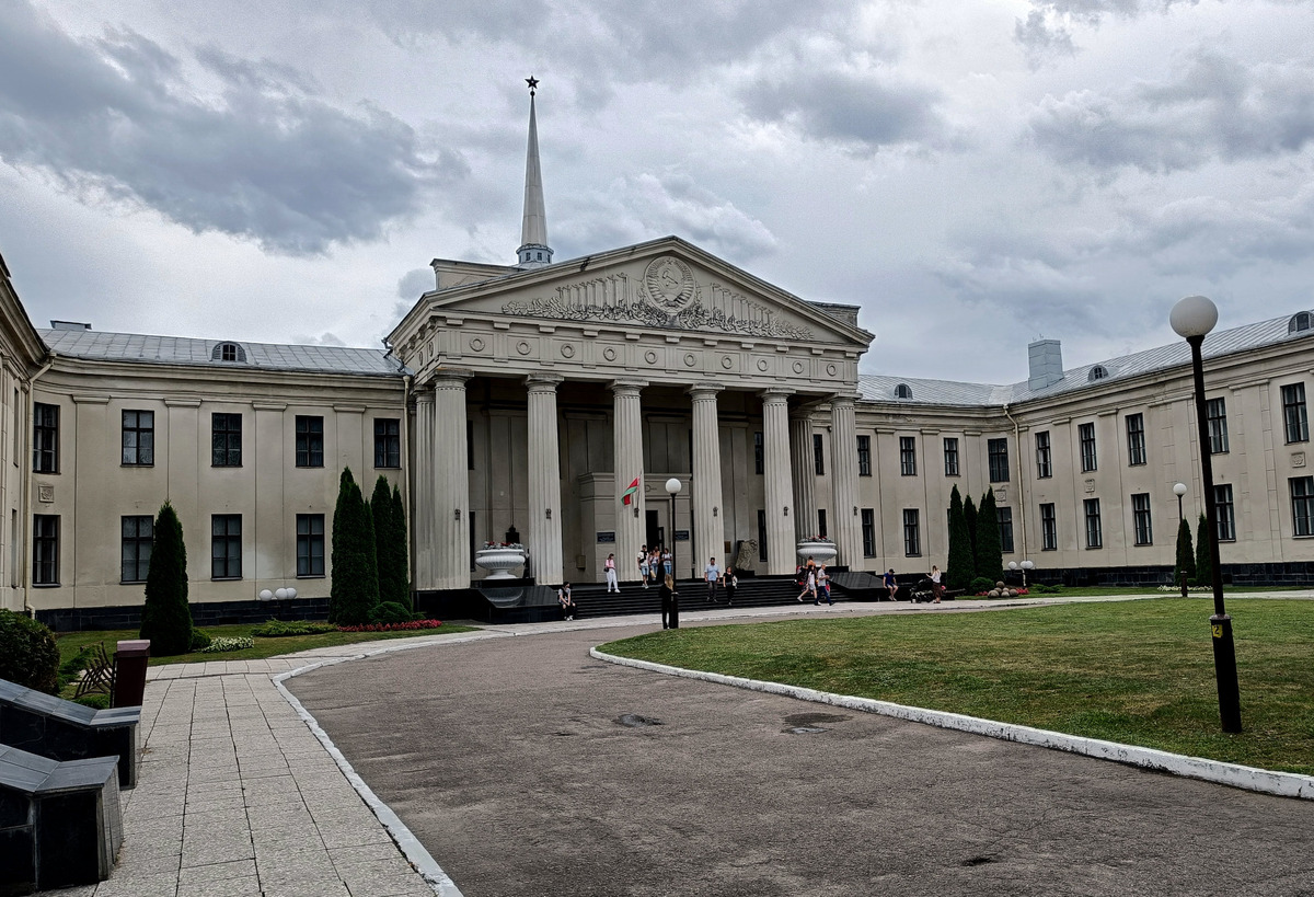 После Старого замка переходим в Новый замок, он в двух шагах через дорогу. Это тоже подразделение Гродненского государственного историко-археологического музея, и у этого здания не менее сложная история. Сразу бросается в глаза герб СССР на фронтоне здания, который подсказывает, что что-то здесь точно менялось в XX веке. И правда: в 1944 году здание сильно пострадало в ходе боевых действий и его пришлось восстанавливать. Сюда переехал областной комитет партии, отчего фронтон был украшен государственным гербом.