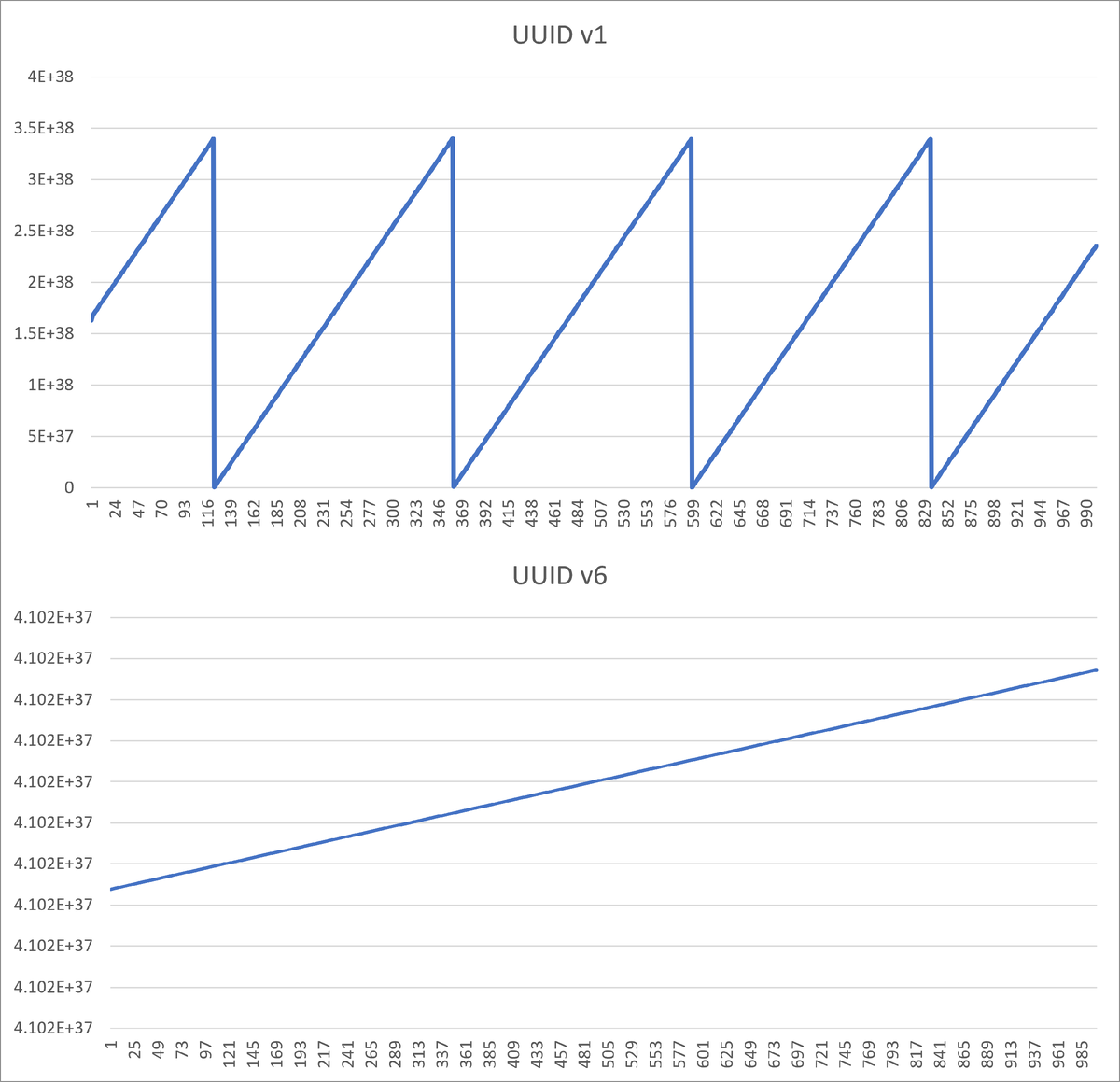 Как видно, UUIDv1 какое-то время монотонно растет, после чего происходит падение и цикл повторяется вновь. Продолжительность цикла составляет примерно 7.2 минуты, следовательно, каждые 7.2 минуты будет наблюдаться небольшое снижение производительности при вставке новых ключей (во всяком случае, теоретически). Так происходит из-за того, что в формате UUIDv1 время закодировано с обратным порядком байт — от младшего разряда к старшему. Поскольку младшие разряды меняются быстрей старших, появляется "цикличность", которая и наблюдается на графике.