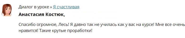 «Спасибо огромное, Леся! Я давно так не училась как у вас на курсе! Мне все очень нравится! Такие крутые проработки!» — написала она с неподдельной радостью.