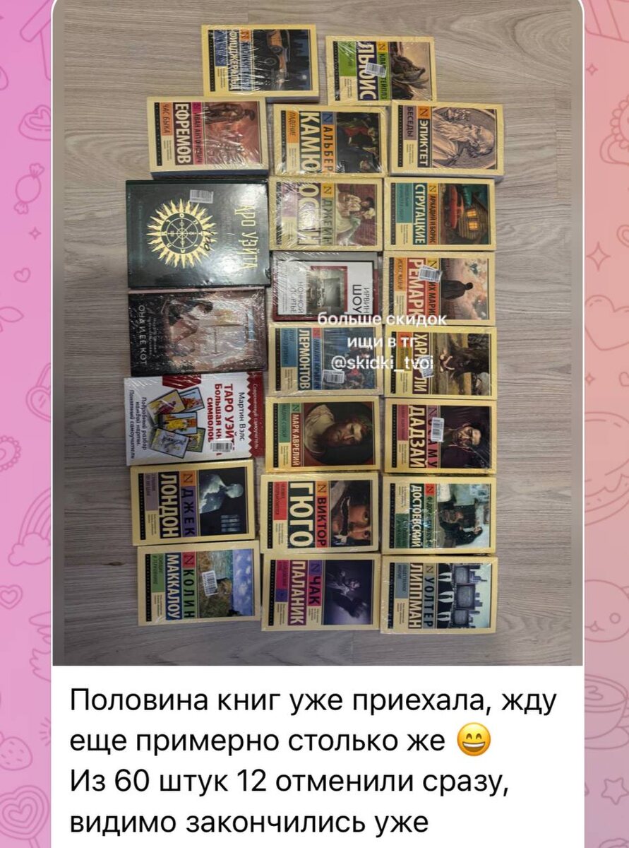 Всем привет Все кто со мной давно уже знает , что долгое время я состою в группе скидок Очень долгий период что то там брала на перепродажу для Авито и достаточно неплохо продавала Скидки там на разные категории товара Например на днях были книги по 1 рублю Очень многие успели закупиться книгами , у кого то часть отменили Кому то приехало почти все Также о скидках в Пятерке узнаю в этой же группе Вчера вся группа дружно скупала шоколад В своё время я много одежды купила , благодаря этой группе за копейки Например Себе джинсы за 500 р, которые через 2 часа стали стоить 3000 Примеров много , о них я уже писала неоднократно Кому интересно ссылку на группу , где можно купить книжки по 1 рублю , оставлю в комментариях Всем хорошего дня и отличного настроения ❤️