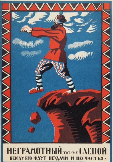 Кроме того, при кардинальном переустройстве политической и социальной системы новой власти требовалась эффективная пропаганда. Власть была заинтересована в том, чтобы миллионы людей читали газеты, наизусть вызубривали тексты плакатов и транспарантов... Для этого необходимо хотя бы начальное образование. Чтобы гражданин Страны Советов мог хотя бы понять плакат, изображавший мужика в лаптях, шагающего в пропасть со «слоганом» «Неграмотный — тот же слепой. Всюду его ждут неудачи и несчастья».