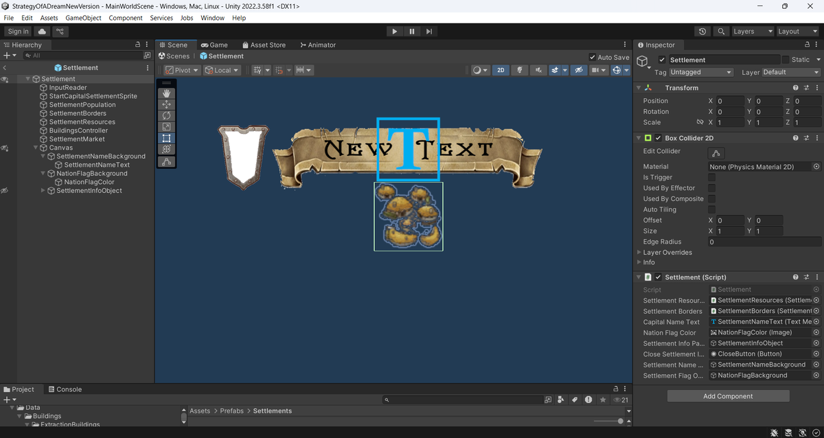 Разработка стратегии мечты – Префаб стартового поселения. Приветствую, дорогие друзья! Продолжаем работу над нашей глобальной стратегией. В этой публикации мы создадим префаб стартового поселения. Что для этого на необходимо сделать!? Во-первых, на главной сцене создадим пустой объект Settlement, добавим ему дочерним объектом спрайт для отображения поселения. Объекту Settlement необходимо добавить компонент BoxCollider для взаимодействия. Вот такое у нас получилось поселение – Теперь поселению добавим дочерним обьектом Canvas и два поля с картинками для отображения названия столицы и флага – В прошлой публикации мы создавали нации, так вот в строках представленного там скрипта, в методе - private void SpawnCapital(Nation nation) мы как раз и задавали название столицы, и цвет флага – settlement.SetName("Moskow"); settlement.SetFlagColor(nation.Color); Остальные объекты мы разберем в следующих публикациях, на этом буду прощаться. Спасибо.