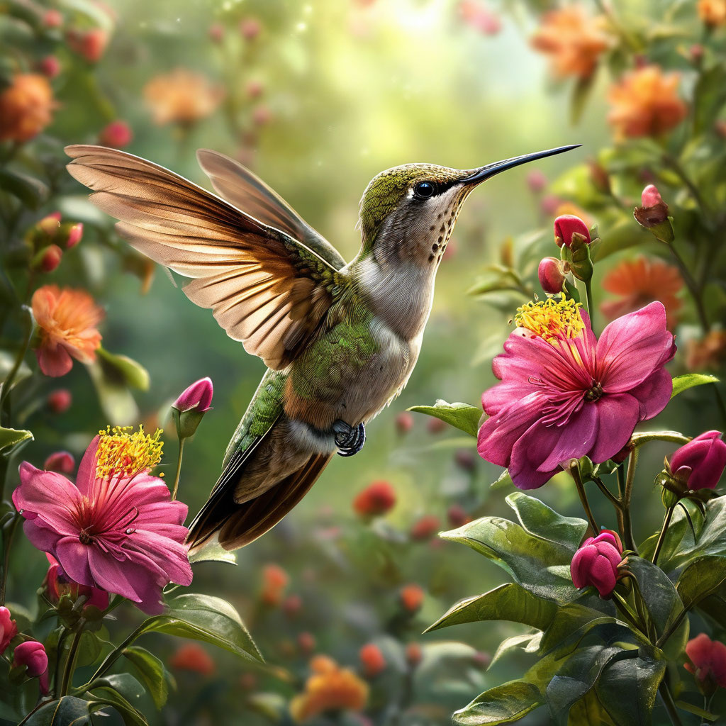 Птичка - колибри приносит радость и удивление, когда видишь ее в лесу с красивыми цветами и наслаждаешься ее интересным жужжанием.
