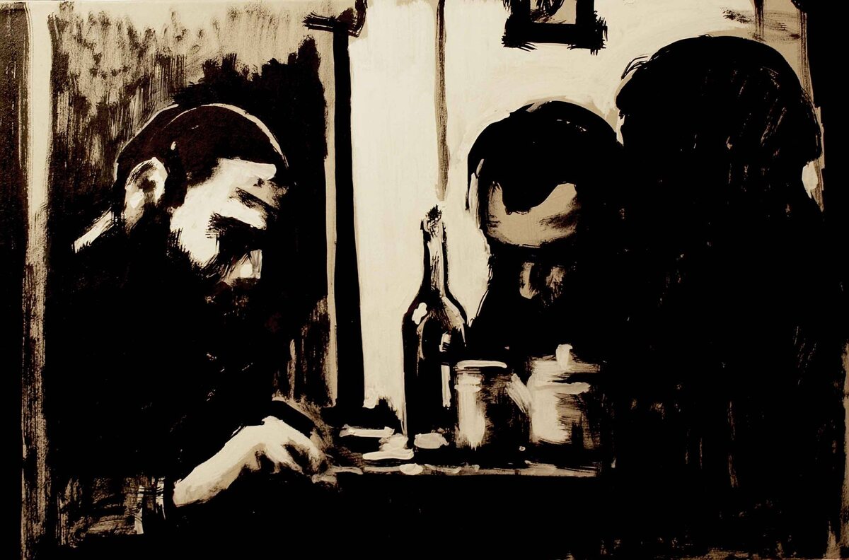 Некоторые сюжеты художника отличает добрая ирония. Кот, свернувшийся клубком, мысли ишака, нарисованные буквально, как в популярных комиксах, встретившиеся за бутылкой товарищи – изображения кажутся более живыми, чем их прообразы, выглядят богаче эмоционально. Константин очень нежно относится к миру и это трогает. Несмотря на уверенность и твердость линий, картины, выходящие из-под его руки, выглядят изящными, тонкими, а персонажи добрыми и чуткими. И несмотря на то, что автор всегда оставляет зрителю пространство для собственных ассоциаций и интерпретаций, при взгляде на картины Константина Малютина возникает почти чувственное ощущение, что этот тонкий и изящный мир есть отражение реальности, преображенной через его духовный опыт.